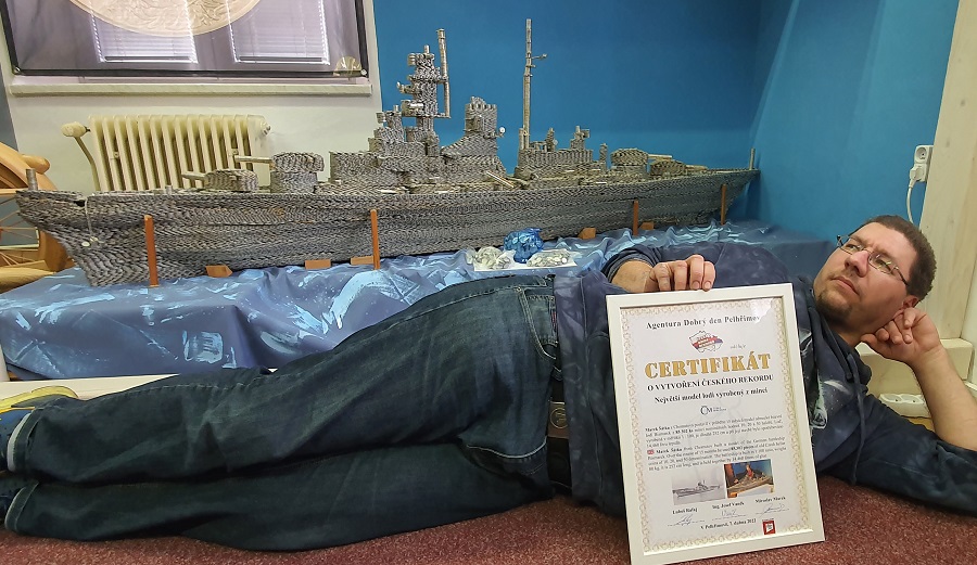 Modelář Marek Šátka z Chomutova pracoval na stavbě bitevního kolosu celých 15 měsíců. Použil deseti-, dvaceti- a padesátihaléřové mince, které lepil chemoprenem. Spotřeboval 14,5 litru lepidla. Na úctyhodný model o délce 252 cm, vytvořený věrně podle dostupných plánů v poměru 1:100, padlo 24 888 kusů 50haléřových mincí, 27 665 kusů 20haléřových a 32 749 kusů 10haléřových. Lodi dlouhé 252 centimetrů nechybí rádiové věže, děla, záchranné čluny či dvě malá letadla. Model zapsaný v České knize rekordů váží 80 kilogramů a z bytu pana Šátky musel být vystěhován vysokozdvižnou plošinou. Úsměvně rovněž vyznívá skutečnost, že modelář byl svého času donucen práce na jeho stavbě přerušit, protože mu prostě došly prachy (stavební materiál). Sbírka do které haléřovými mincemi přispěli přátelé, ale i úplně neznámí lidé, vše vyřešila.