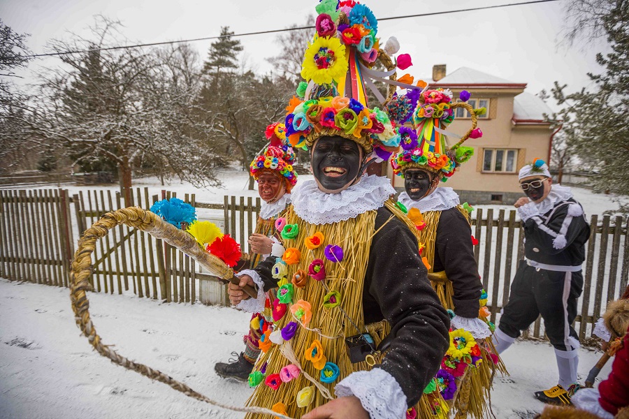 „V čele průvodu kráčí maska zvaná laufr nebo strakatý, který obvykle kolem osmé hodiny ranní požádá představitele obce o povolení k obchůzce. Po jeho získání pak celý den vede tato maska průvod pěkně dům od domu. Žádný dům nesmí vynechat a všude musí zatancovat a popřát vše dobré. Kostým laufra tvoří bílá halena, bílé kalhoty a vysoká špičatá čepice. Vše je pošité barevnými odstřižky látek. Těch má být 365, stejně jako dnů v roce. A jejich pestrá barevnost znázorňuje různorodost každého dne v životě člověka. Další zajímavou maskou je určitě maska slaměného. Jak název napovídá, kostým je upleten ze slámy. Jedná se o žitnou slámu, která je pěkně dlouhá. Slaměný se válí s přihlížejícími ženami po zemi, aby se na ně přenesla plodivá síla. Někteří přihlížející diváci trhají ze sukně slaměného stébla, aby je následně dali do posad husám, kachnám nebo do kurníků slepic. Podle tradice si tak zajistí, že bude drůbež prospívat,“ uvedla Ilona Vojancová, odborná pracovnice Muzea v přírodě Vysočina.