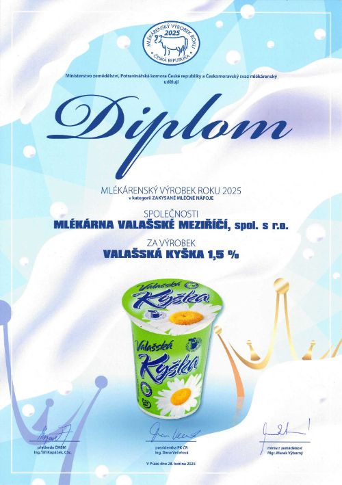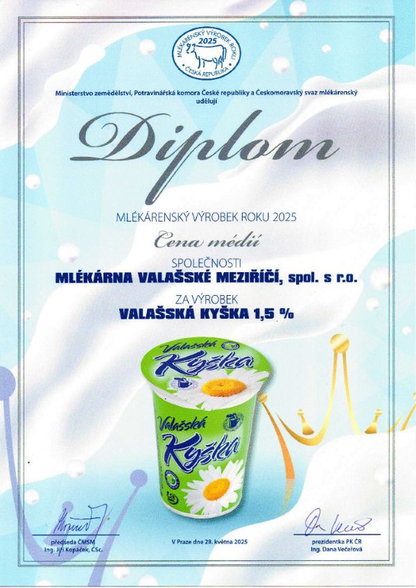 Dlouhá, stabilní a spolehlivá, tak bychom mohli charakterizovat cestu Valašské kyšky, stálice v sortimentu Mlékárny Valašské Meziříčí. Obliba tohoto výrobku rok od roku roste, a to nejen mezi milovníky čerstvých kysaných produktů, ale i mezi odborníky. Valašská kyška se stává symbolem kvality a tradice, která v dnešní době plné inovací a novinek nabízí jistotu. Valašská kyška je ideální volbou pro každého, kdo si chce vychutnat lahodnou chuť a zároveň podpořit své trávení. Kysané mléčné výrobky jsou bohatým zdrojem plnohodnotných bílkovin, vápníku, fosforu a vitaminů skupiny B. Mlékárna Valašské Meziříčí si po celá léta zachovává vysokou kvalitu složení Valašské Kyšky, a to i v době, kdy je tlak na cenu surovin, jako je mléko, stále silnější. Tento přístup byl oceněn nejen spotřebiteli, ale i odbornou porotou, která zvolila Valašskou Kyšku Mlékárenským výrobkem roku 2025 v kategorii Zakysané mléčné výrobky. Výrobek si odnesl také Cenu médií. Ocenění uděluje Ministerstvo zemědělství, Českomoravský svaz mlékárenský, Český komitét Mezinárodní mlékařské federace, Sekce pro mléko při Potravinářské komoře ČR a Ústav mléka, tuků a kosmetiky VŠCHT Praha. Letos se 22. ročníku soutěže „Mlékárenský výrobek roku“ zúčastnilo 18 tuzemských výrobců s celkem 55 výrobky, které byly hodnoceny v devíti kategoriích. Odborníci i veřejnost si takto připomněli Světový den mléka, který se slaví již od roku 1957. Záštitu nad letošní oslavou převzal ministr zemědělství Mgr. Marek Výborný.