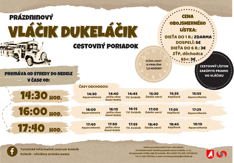 Vláčik Dukeláčik stojí už aj v Kapišovej Premáva už aj turistický vláčik Vláčik Dukeláčik vo Svidníku a to denne od stredy do nedele, do konca prázdnin. Trasa je Svidník-Údolie smrti, frekvencia 3-krát denne, trvanie jazdy je cca 1,5 hod a má 5 zastávok (aquapark Aquaruthenia, Pešia zóna-Hotel Rubín, TIC Svidník, Údolie smrti a Kapišová). Vláčik má v rámci svojho grafikonu naplánovanú aj návštevu Údolia smrti, v ktorom je možné vystúpiť. Vláčik bude mať v tomto roku novú zastávku v obci Kapišová. Jazda vláčikom je sprevádzaná audiosprievodcom a ľudovou hudbou Svidníckeho súboru Makovica. Cestovné platí celý deň, dospelí platia obojsmerne 5 EUR, deti do 6 rokov, ZŤP a dôchodcovia 3 EURÁ a v rámci jednej ceny je možné nastupovať a vystupovať na zastávkach na trase. Vo Vláčiku a v Turistickom informačnom centre si viete zakúpiť limitovanú edíciu drevených píšťaliek s Vláčikom a nápisom Svidník na pamiatku. Presnejšie informácie sú na www.svidnik.sk alebo facebooku a instagrame mesta Svidník.