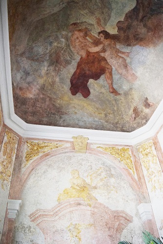 Námětem malířské výzdoby bočního prostoru je únos Órethyie Bóreásem. Podle řecké mytologie byl Boreás bohem severního, tedy nejsilnějšího, větru. Dlouho se ucházel o dceru athénského krále Órethyiu. Protože její otec se zasnoubením váhal, rozhodl se zmocnit nevěsty násilím. Právě tento výjev je zachycen na fresce. Boreás je zpodobněn jako statný stařec s křídly, který odnáší mladou ženu. Z jejich svazku se následně narodily čtyři děti, dva synové a dvě dcery, kteří jsou zpodobněni v rozích. Stěny místnosti potom zdobí dekorativní vzory, festony a maskarony. Pokud finanční prostředky dovolí, bude obnova barokní fresky pokračovat i v letošním roce. Nově zrestaurovanou část si návštěvníci zámku mohli poprvé prohlédnout v rámci jarního slavnostního otevření jižních zahrad.