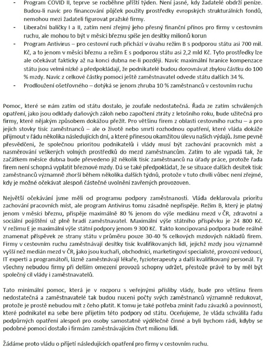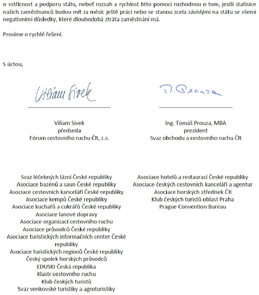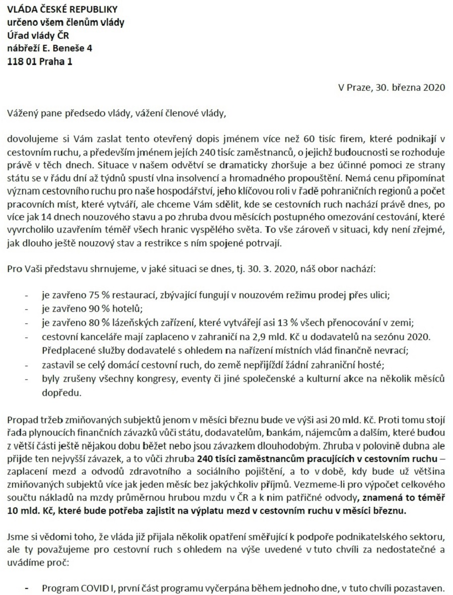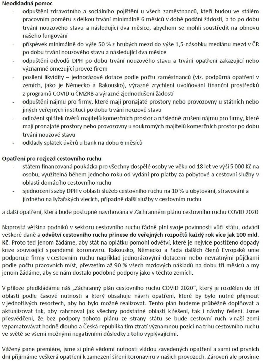 Otevřenýdopis vládě České republiky ve věci záchrany cestovního ruchu jménem Fóra cestovního ruchu a Svazu obchodu a cestovního ruchu České republiky z 30. března 2020 zde a jejich návrh Záchranného plánu cestovního ruchu COVID 2020 tady. Připravila Martina Košlíková.