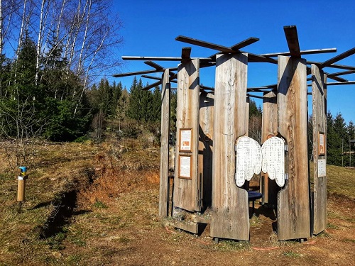 která klade důraz na smyslový prožitek krajiny a genia loci místa. Odstavit automobily lze u obecního úřadu, na parkovišti nad koupalištěm či u Kiosku Milíře a na sedm kilometrů dlouhou trasu nastoupit kdekoliv v obci. Orientaci od jednoho zastavení k druhému usnadňují dřevěné modro žluté kužely umístěné podél cest. Stezka má navíc i zkrácenou dvoukilometrovou dětskou odbočku nazvanou Procházka lesem s veverkou Bertou, jež je značená veverčí stopou. Děti na této trase poznávají život zvířat v lese a plní úkoly.