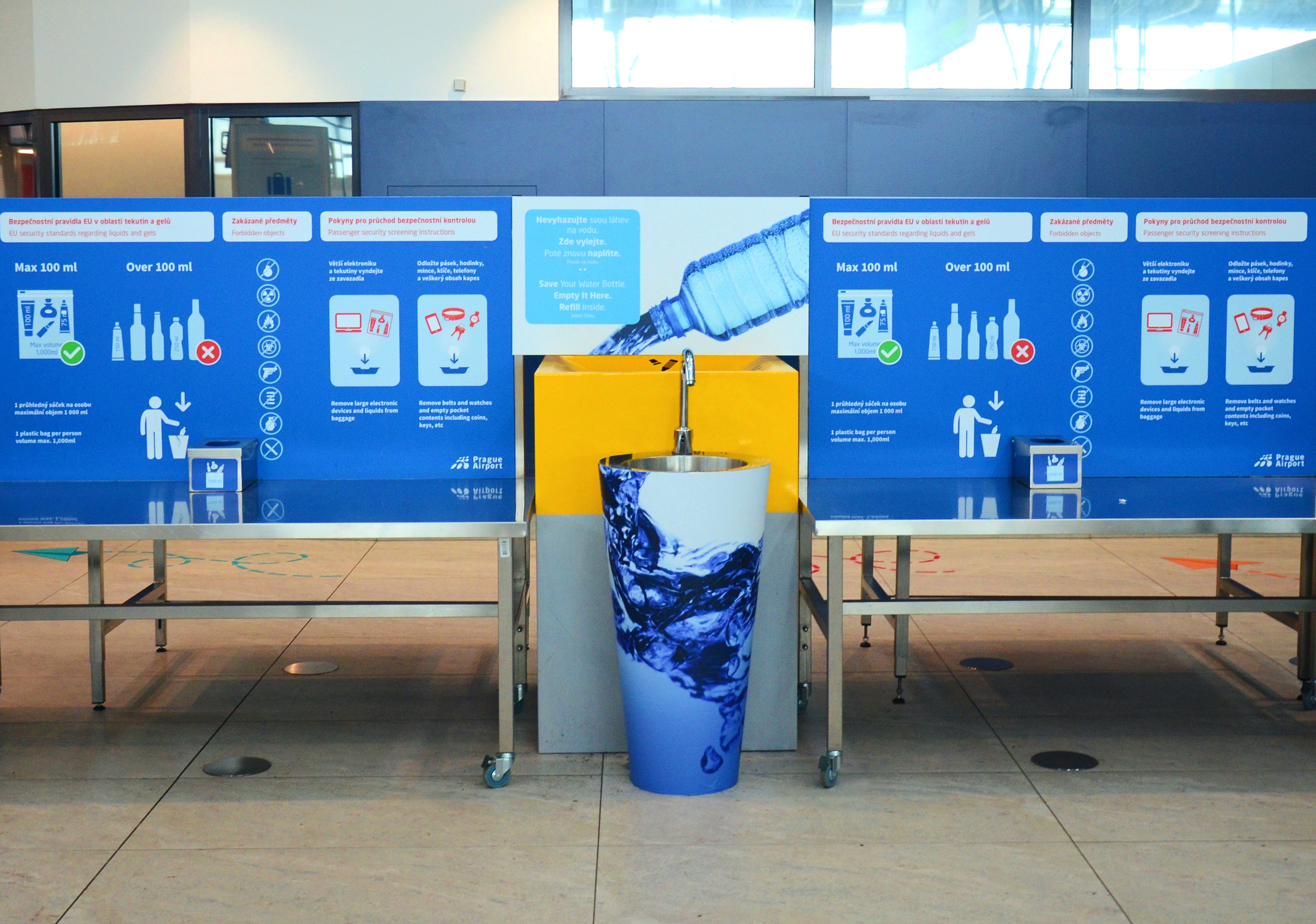 „Přestože Evropský parlament schválil zákaz používání jednorázových plastů až od roku 2021, Letiště Praha přichází s vlastní iniciativou již nyní a do praxe bude postupně zavádět konkrétní opatření na snižování jednorázových plastů. Cílem je mimo jiné motivovat cestující, aby snižovali svůj dopad na životní prostředí a cestovali tak například se znovupoužitelnými lahvemi na nápoje či v případě zakoupení nápojů v jednorázových plastových lahvích je před bezpečnostní kontrolou nevyhazovali, ale vyprázdnili je a poté dále používali,“ uvedla Soňa Hykyšová, ředitelka Ochrany životního prostředí Letiště Praha. K tomu může cestujícím nově pomoct systém výlevek a pítek, kdy cestující jednoduše vodu z lahve vylijí před bezpečnostní kontrolou do výlevky a po průchodu kontrolním bodem si prázdnou lahev opět zdarma naplní pitnou vodou z jednoho ze 13 dostupných pítek. První výlevku mohou cestující vyzkoušet v Terminálu 2 již nyní a v budoucnu připravuje Letiště Praha instalaci několika dalších.