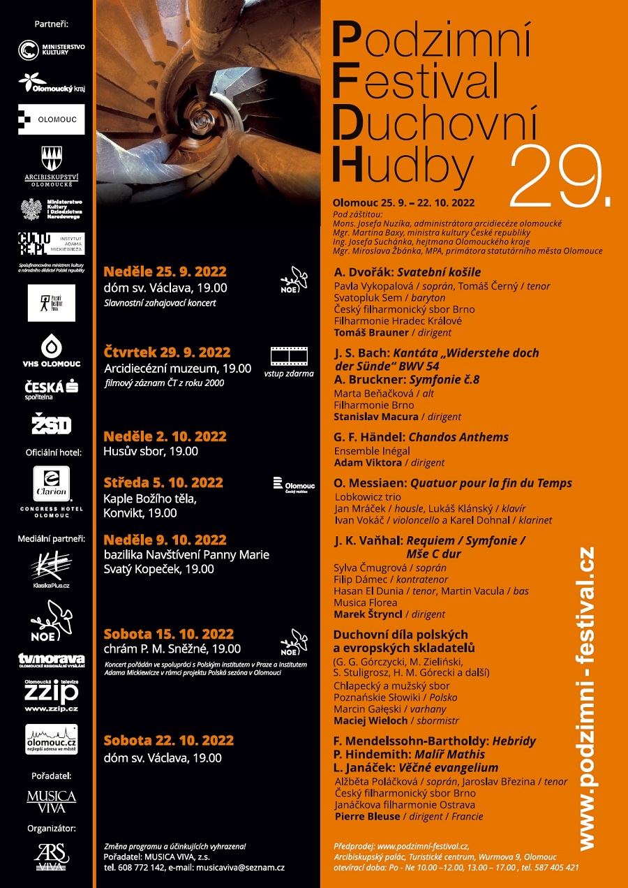 Letošní ročník Podzimního festivalu duchovní hudby zachovává tradiční dobu konání, počet koncertů i kvalitu pozvaných interpretů jako ročníky předešlé (25.9.-22.10. 2022). Využívá mimořádného genia loci města Olomouc a je určen především pro jeho obyvatele a návštěvníky. Festival zaštítil a finančně podpořil administrátor olomoucké diecéze, hejtman olomouckého kraje, primátor města Olomouc a ministr kultury ČR. Koncerty jsou umístěny do historicky cenných a akusticky pozoruhodných prostor spojených s duchovním, společenským a kulturním životem Olomouce. Návštěvníci jsou zváni na sedm koncertů do arcidiecézního muzea a do pěti dominant města: dómu sv. Václava, chrámu Panny Marie Sněžné, baziliky Navštívení Panny Marie na Svatém Kopečku, kaple Božího těla / Konvikt a do Husova sboru. Program letošního ročníku nabízí ojedinělý a žánrově i druhově pestrý program složený z duchovní hudby více než šesti století.