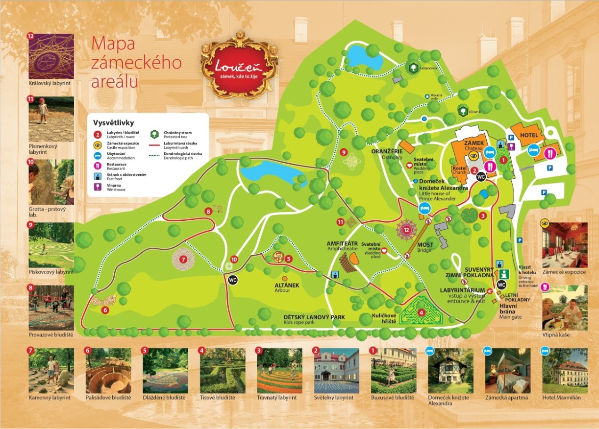 Zámek Loučeň je jednou z nejnavštěvovanějších památek ve Středočeském kraji. Zámek, postavený na počátku 18. století a vlastněný rody Valdštejnů, Fürstenberků a Thurn-Taxisů, je provozovaný společností Zámek Loučeň a.s. a od 7. 7. 2007 je přístupný veřejnosti. Lákadlem pro návštěvníky je kromě prohlídek s kostýmovanými průvodci rozlehlý romantický anglický park s labyrintáriem, unikátní kolekcí jedenácti labyrintnů a bludišť, postavené dle návrhu britského projektanta Adriana Fishera. Celý zámecký areál je památkově chráněný. Dvanáctý královský labyrint, který na Loučeni vznikl při příležitosti 700 let od narození Karla IV., má velikost, tvar i symboliku inspirovanou labyrintem katedrály v Chartres. Loučeňský labyrint je doplněn kruhem o průměru 10 m na půdoryse české kotliny. Stezka kruhového labyrintu je nejenom geometrickým symbolem a připomínkou historie, ale především geo-energetickou spirálou nabitou pozitivní energií. Labyrint je kruhový, chartreského typu, s jedenácti řadami a kruhovým centrálním prvkem uprostřed. Soudobý charakter a přitažlivost pro návštěvníky dodává Dvanáctému labyrintu použití barevných prvků na jeho povrchu, ozvučení prostoru nad ním a možnost večerního nasvícení. Připravila Kateřina Gorškov Řeháková.