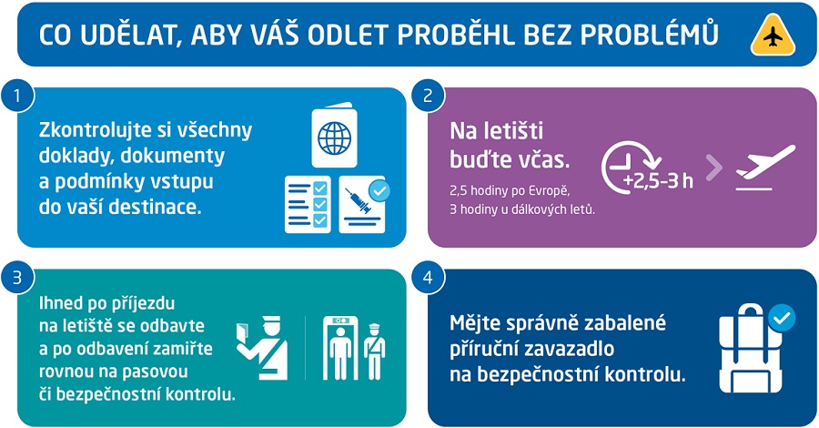 - Dostatečnou časovou rezervu na cestu na letiště a průchod samotným letištěm i když půjde o online odbavení – na letišti je ideální být 2,5 hodiny před odletem po Evropě, 3 hodiny a víc u dálkových spojů a v případě, že má cestující nadrozměrné zavazadlo.