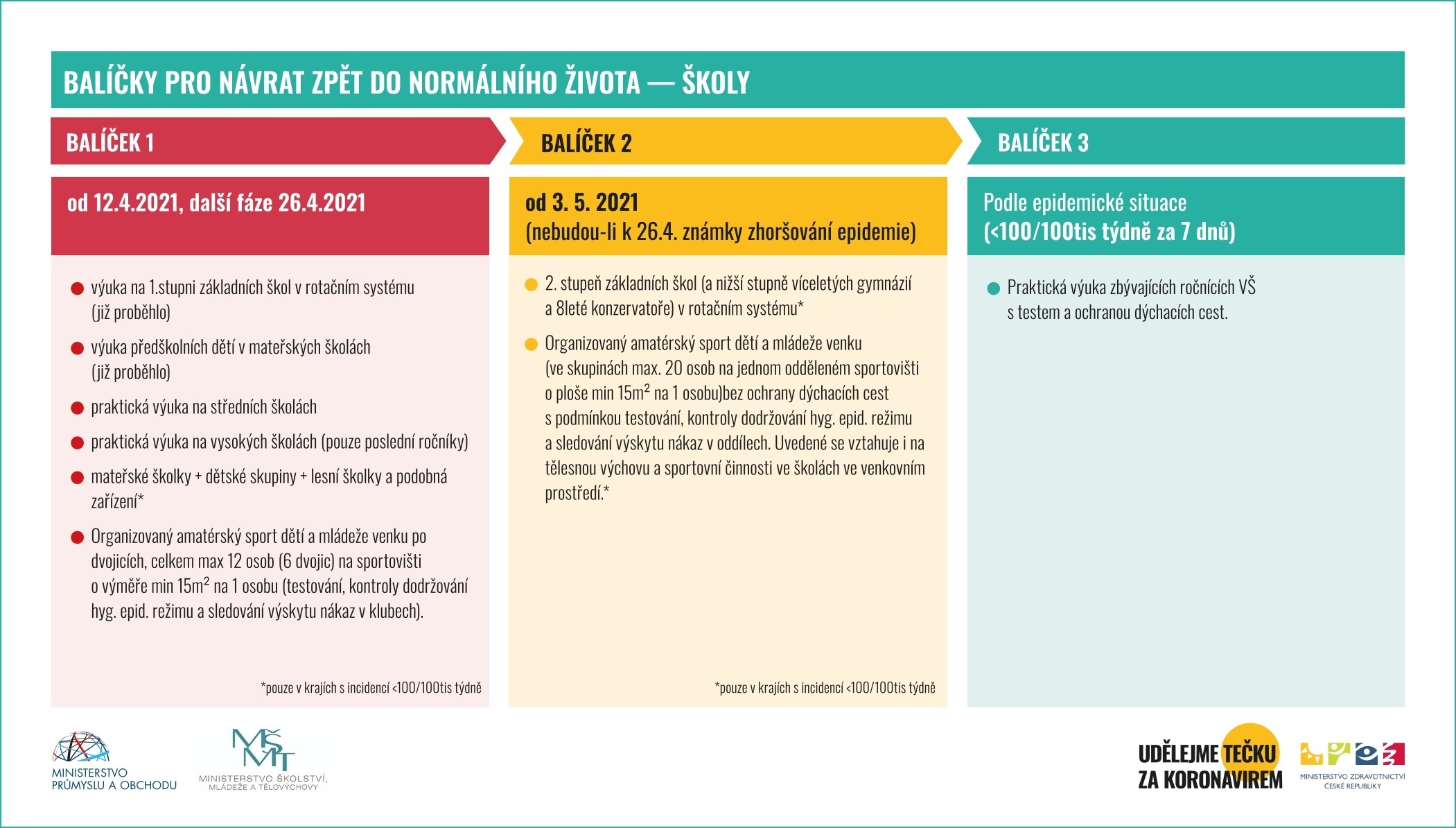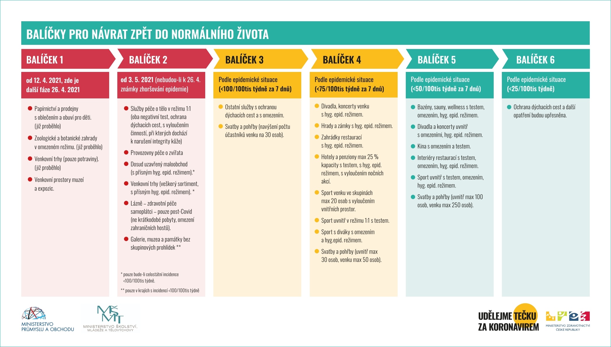 Balíček přináší značný nárůst mezilidských kontaktů a rizika přenosu nákazy, realizovat jen při příznivém vývoji epidemie komplexně posouzeném.