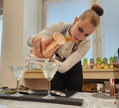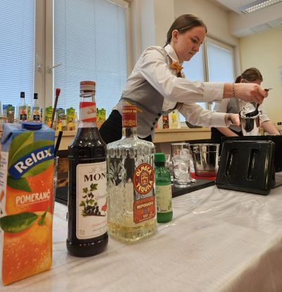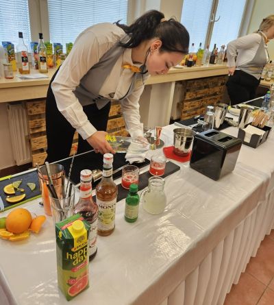 Vyvrcholením celého workshopu se stala soutěž v přípravě míchaných drinků. Hlavní roli hrály technika, chuť a vzhled nápoje. V přátelské náladě a příjemném prostředí vznikaly nápoje v atraktivních odstínech – od jemné smetanové přes slunečně žlutou, azurovou modř, oceánskou zeleň až po rubínově červenou. Barevné koktejly zdobené ovocem s pečlivě vyladěnými detaily působily jako malá umělecká díla. Kreativita studentů se promítla i do názvů drinků. Odbornou porotu okouzlily romantický Západ slunce na louce, hravý Belgický maliňák, tajemný Pistáciový sen či něžná Modrá vášeň.
