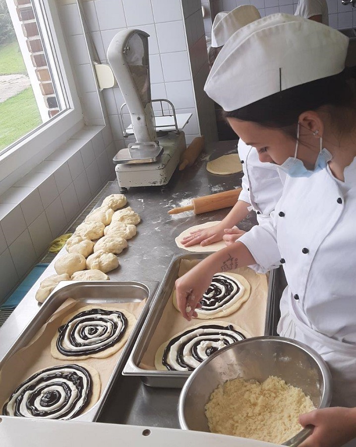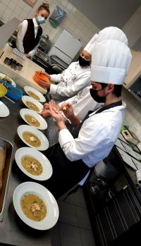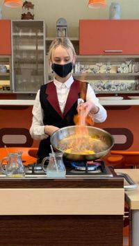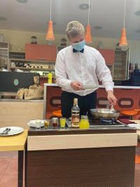 Mgr. Markéta Kselíková, vedoucí oboru Kuchař-číšník, jeho slova konkretizuje: „V naší škole se slova jako kreativita a nápaditost dají skloňovat ve všech pádech, každý den, u všech učitelů odborného výcviku. I v době distanční výuky se ukázalo, že nás nic nezaskočí – o akcích, které proběhly, byl napsán nespočet článků. Nebudu je vyjmenovávat, nemůžu chválit jednotlivé učitele, to bych musela mluvit opravdu hodně dlouho. Však jste jistě všechny četli v novinách, nebo si je znovu můžete připomenout na našich webových stránkách. Kdybych měla v současné době něco vyzdvihnout, tak určitě školní bar, to je chlouba naší školy. A s ním je spojena Petra Čapounová, jeho dobrá duše. Miluje pečení, takže na baru lze zakoupit různé dorty, tiramisu, štrúdl, prostě mnoho druhů moučníků, které v rukou žáků vznikají pod jejím vedením. A aby té nabídky nebylo málo, zrovna minulý týden nás informovala o novince nazvané příznačně Snídaně je základ dne. Nejen u žáků, ale i u učitelů se ranní setkávání na baru stalo příjemným nastartováním dne, kde si pochutnáváme na vejcích upravených na sto způsobů! Teď jsem vychválila bar, tak přece ještě pár slov, protože opravdu nemůžu opomenout ostatní. Týmovost je základ a v našich gastronomických oborech funguje obzvlášť! Všichni naši učitelé odborných předmětů dávají našim žákům opravdu velký prostor pro jejich seberealizaci. Jen stručně o dvou posledních projektech. První s názvem Pečeme s úsměvem - žáci předvedli svůj pekařský um a obdarovali seniory v Božicích. Druhou výzvou byl Master Chef – soutěž ve vaření z chřestu. Žasli jsme, jaké recepty jsou naši žáci schopni vymyslet a realizovat!“