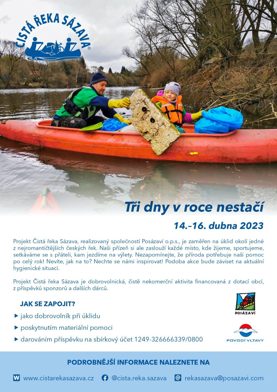 Velký úklid 80kilometrového úseku řeky Sázavy mezi Kácovem a Pikovicemi se letos uskuteční od 14. do 16. dubna. Projekt známý jako Čistá řeka Sázava letos dosáhne plnoletosti! Stejně jako v předchozích 17 letech budou dobrovolníci z hladiny i břehů sbírat vše, co tam nepatří. K účasti je třeba se přihlásit předem na www.cistarekasazava.cz. Registrace bude spuštěna v polovině února 2023. Loni se do akce zapojilo celkem 761 lidí, kteří sesbírali 16,284 tuny odpadků.