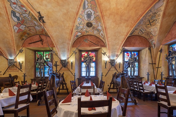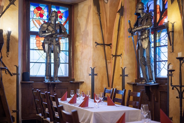 Menu restaurace Old Armoury Prague Rytířský sál restaurace Old Armoury Prague odráží atmosféru pozdního středověku. Původně se zde nacházela jízdárna. Dnes patří restaurace díky Rytířskému sálu s bohatou výzdobou historickými replikami zbraní a brnění zbrojnošů, rytířů, mušketýrů a rustikálními dekoracemi a díky interiéru s klenutými stropy k jedné z nejzajímavějších historických restaurací v Praze. Na hosty zde dýchne unikátní atmosféra historie v kombinaci s gurmánským zážitkem zdejších mistrů kuchařů, kteří do historického prostředí restaurace připravili tradiční české menu kladoucí důraz na vždy čerstvé suroviny nakoupené v maximální míře od lokálních dodavatelů. V předkrmech zaujmou např. Grilované pikantní klobásky s cibulovým salátkem s chilli papričkami a estragonem, hrubozrnnou hořčicí a chlebem. V hlavních jídlech pak nechybí české klasiky jako Pečené vepřové koleno se zelným salátem, krémovým křenem, hořčicí a chlebem nebo Vepřová pečená žebra s pikantní kouřovou marinádou, zelným salátkem, marinovanou cibulí a chlebem, ale i vegetariánská jídla jako Rozpečený kozí sýr s vlašskými ořechy a medem, rukolou, červenou řepou a slunečnicovými semínky. Mezi dezerty jsou stálicemi Lívanečky s borůvkovým žahourem, skořicovým cukrem a zakysanou smetanou nebo populární Dukátové buchtičky s teplým vanilkovým krémem. Nabídka vinného lístku, který je zaměřen na vysoce kvalitní vína tuzemské produkce už jen podtrhne příjemně strávený čas v prostředí Rytířského sálu.