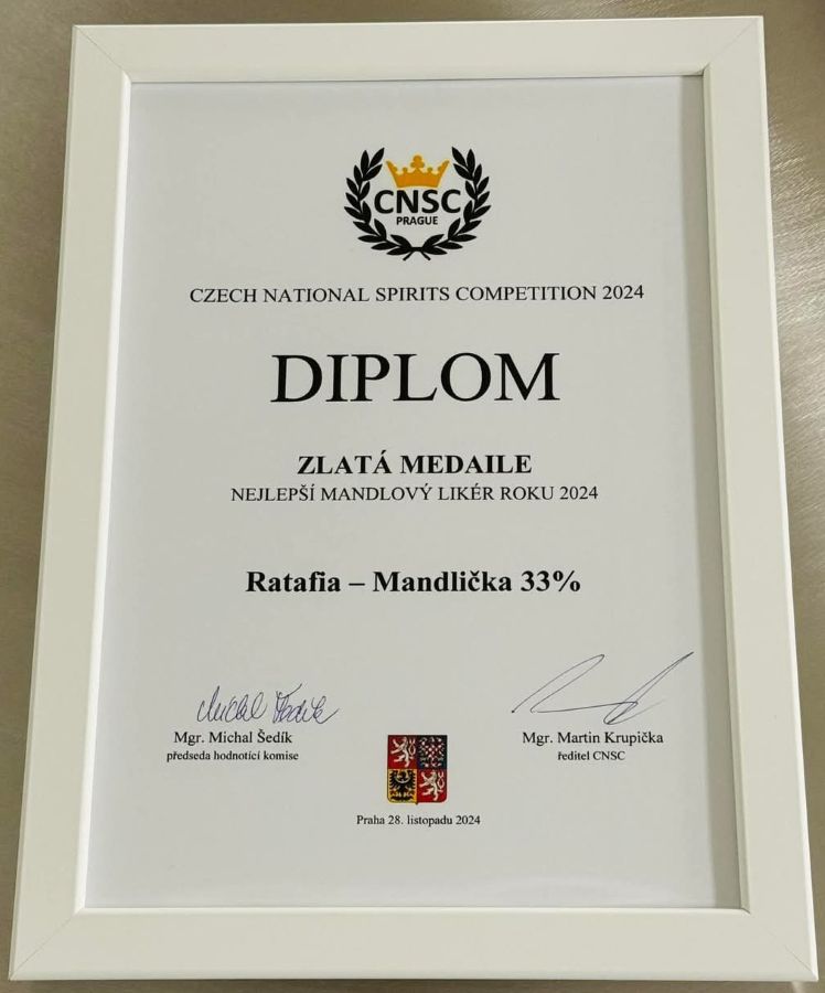 Přírodní řemeslné ovocné likéry s jemným nádechem mandlí, Ratafia Almond Spirit, které vyrábí rodinná firma manželů Kleinerových z moravského Žešova u Prostějova, zazářily na letošním 4. ročníku největší mezinárodní soutěže destilátů a likérů v Česku – Czech National Spirits Competition 2024. V kategorii mandlových likérů získala jejich Ratafia Mandlička 33 % zlatou medaili jako nejlepší mandlový likér roku 2024.