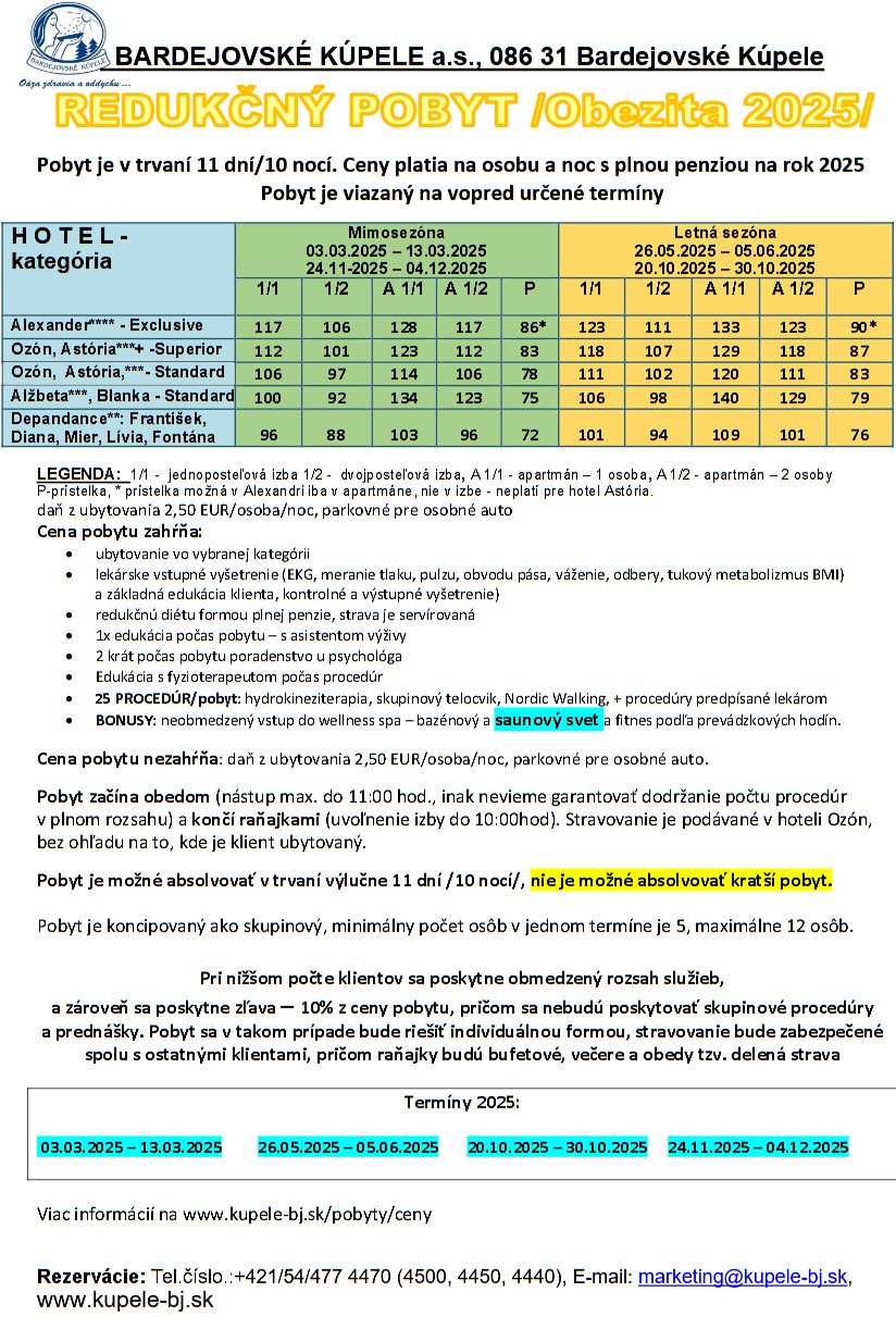 Cena a podmienky Cena pobytu zahŕňa ubytovanie, lekárske vyšetrenia, redukčnú diétu, procedúry a edukáciu. Nezahŕňa daň z ubytovania a parkovné. Pobyt je možné absolvovať v termínoch 26. 5. – 5. 6., 20. 10. – 30. 10. a 24. 11. – 4. 12. 2025. Minimálny počet účastníkov je 5, maximálny 12.