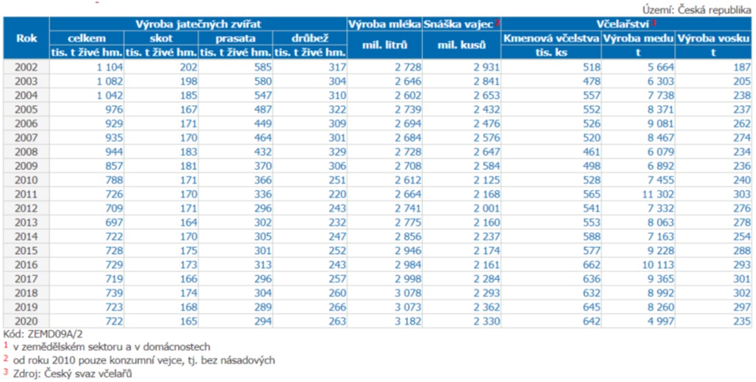 Produkce medu loni v Česku klesla meziročně o zhruba 40 procent na 4997 tun. ČTK to zjistila z webu Českého statistického úřadu. Podle dat ČSÚ je to nejméně od roku 2002, od kdy publikuje časové řady, podle starších dat ministerstva zemědělství jde o nejhorší výsledek minimálně od vzniku samostatní České republiky v roce 1993. Jak však ČTK řekla předsedkyně Českého svazu včelařů Jarmila Machová, někteří pamětníci mezi včelaři tvrdí, že jde dokonce o nejhorší rok za poslední půl století. Na vině podle ní není koronavirus, nýbrž loňské jarní počasí.