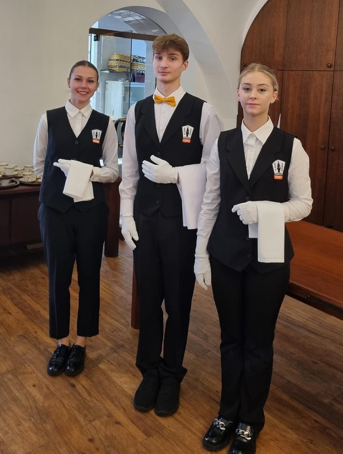 „Ještě jste neřekly, čím vždycky zaujmeme. Při banketní obsluze slavnostních obědů a večeří má každý z nás na starosti přesně stanovený počet hostů dle zasedacího pořádku a obsluha probíhá formou společných nástupů servírování pokrmů a nalévání nápojů. To vše v bílých rukavičkách a synchronizovaně. Je to adrenalin i pro nás!“ dodal s úsměvem Lukáš Kročil z 1. ročníku oboru Kuchař-číšník.
