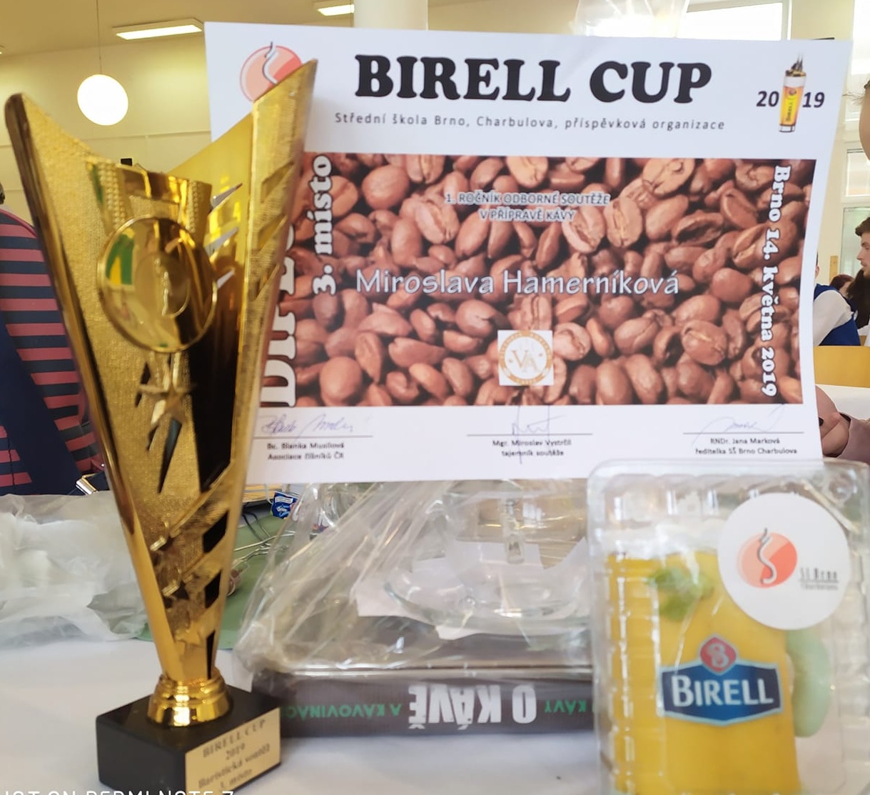 Střední škola Charbulova v Brně zorganizovala 14. 5. 2019 pro studenty škol s gastronomickým zaměřením doprovodnou soutěž baristů Vittoria Adriano Cup 2019, jež byla letos poprvé součástí 19. ročníku BIRELL CUPu. Soutěž se měla uskutečnit v netradičním prostředí školního hřiště a v přilehlých prostorách. Vzhledem k nepřízni počasí byla přesunuta do prostor školy. Studentky 1. ročníku oboru Hotelový a restaurační provoz Miroslava Hamerníková a Kristýna Kubatá měly za úkol během 10 minut připravit 2 kávy Latte macchiato a 2 kávy Flat White. Děvčata využila etching = vypichování, kdy vytvářela obrazce pomocí toppingu nebo kakaa a povrch kávy dozdobila tyčinkou dle fantazie. Součástí byla i znalost teorie z oblasti kávy. Všichni soutěžící obdrželi věcné ceny a drobný dárek v podobě balíčku kávy s vlastním jménem a Mirka za skvělé 3. místo ještě diplom a pohár. Kristýně se taktéž dařilo, umístila se na „bramborovém“ 4. místě.