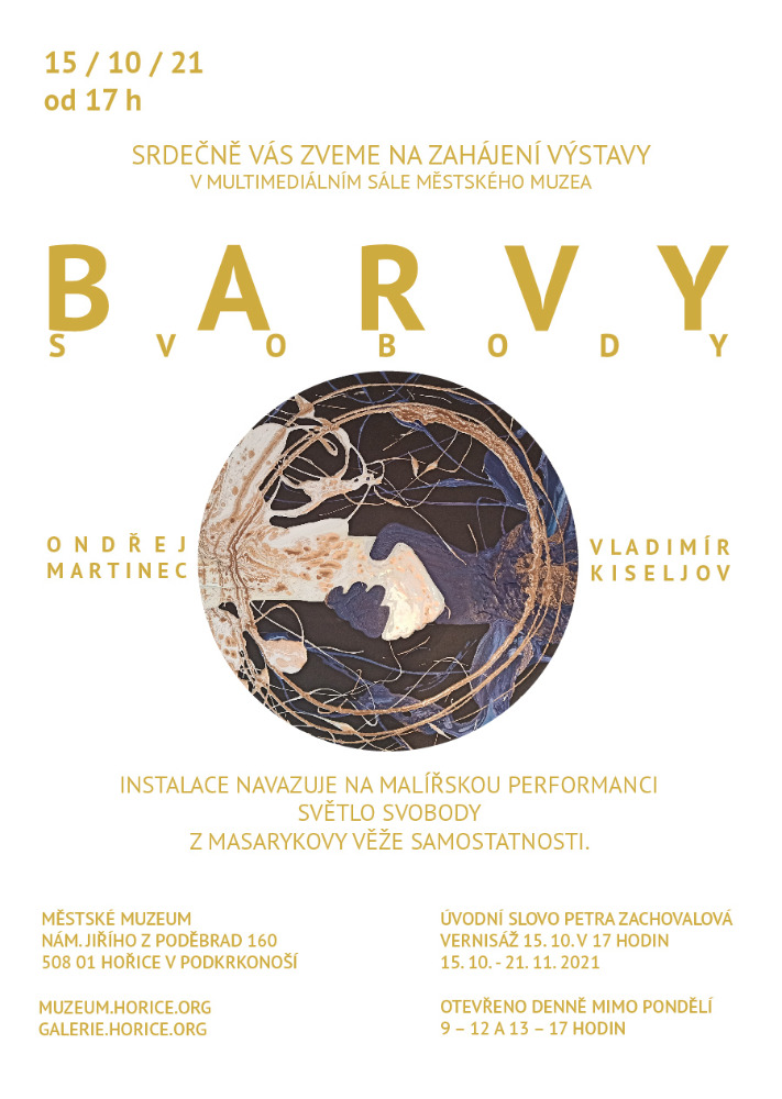 Světlo svobody v Hořicích v Podkrkonoší neuhasíná. Na projekt dvojice autorů ve spolupráci s městským muzeem - SVĚTLO SVOBODY - nasvícení věže malířskou performancí za tónů hudby Josefa Suka, navazuje multimediální výstava maleb Vladimíra Kiseljova s názvem BARVY SVOBODY. Vernisáž proběhne 15. října za hudebního doprovodu Miroslava Vobořila. Výstava pak potrvá do 21. listopadu tohoto roku. Expozice je umístěna v prostorách Multimediálního sálu Městského muzea v Hořicích. Tady návštěvníci uvidí fotografie a video z akce nasvícení Masarykovy věže, a uvidí také unikátní malbu, kterou Vladimír Kiseljov vytvořil během projekce, doplněnou o sérii video vizualizací vytvořených Ondřejem Martincem. Součástí audiovizuální instalace budou i komentované prohlídky za účasti autorů. Celý projekt je provázán myšlenkou propojení a harmonizace naší společnosti. Obzvláště v době, kdy většina lidí v posledním nelehkém období měla možnost pocítit, že tlaků na rozdělení společnosti bylo již dost.