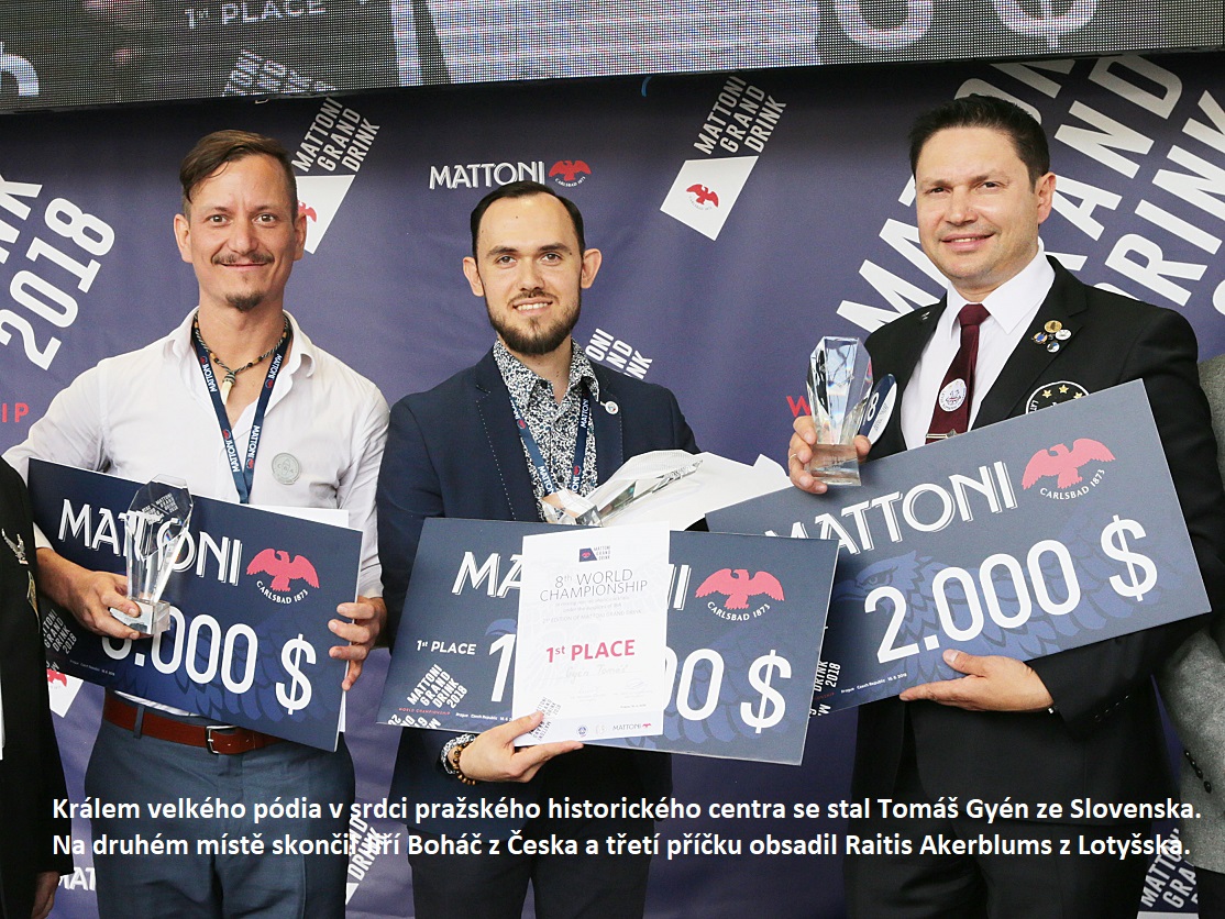 Originální, osvěžující, designově promyšlené, často připravené z nevšedních surovin. Takové byly nealkoholické koktejly, které v sobotu 16. června připravila na Staroměstském náměstí v Praze dvacítka barmanů z celého světa v rámci soutěže Mattoni Grand Drink, která je světovým šampionátem v míchání nealkoholických koktejlů. Králem velkého pódia v samotném srdci pražského historického centra se stal Tomáš Gyén ze Slovenska. Ten do svého drinku Grand Rituals kromě 10 cl minerální vody Mattoni použil ještě 2 cl rakytníkového pyré, 0,5 cl zázvorového sirupu, 0,5 cl citronového freshe a 9 cl cascary. Na druhém místě skončil Jiří Boháč z Česka a třetí příčku obsadil Raitis Akerblums z Lotyšska.