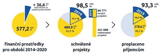 Za rok 2019 bylo příjemcům proplaceno 93,3 mld. Kč, Evropská komise byla zažádána o proplacení téměř 87 mld. Kč a navíc bylo schváleno téměř 67 tisíc nových projektů (z toho přes 52 tisíc v Programu rozvoje venkova) za dalších 98,5 mld. Kč. Z celkových 577,2 mld. Kč (bez zahrnutí výkonnostní rezervy) bylo již na projekty přiděleno téměř 85 % prostředků a Evropská komise zažádána o proplacení více jak 40 % této hodnoty. Peníze ze současného období 2014-2020 je možné čerpat až do konce roku 2023.