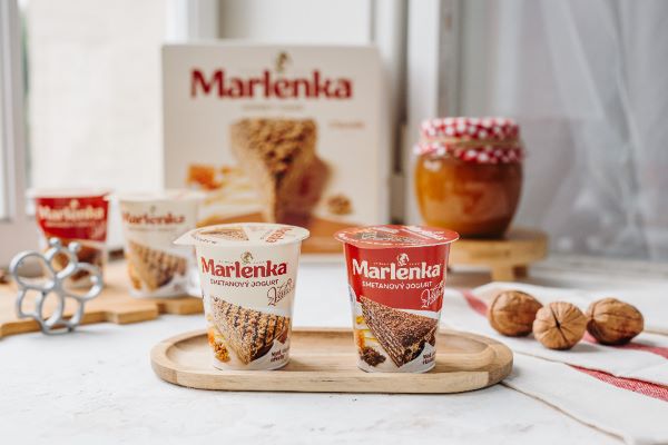 Chuť medových dortů Marlenka si podmanila doslova celý svět. Cestu si našla až do Mlékárny Valašské Meziříčí, kde se po měsících testování spojila kvalita obou výrobků a jejich dokonalé chutě. Zrodil se tak jogurt ve dvou variantách - Smetanový jogurt z Valašska MARLENKA klasický a Smetanový jogurt z Valašska MARLENKA s kakaem. Spojení tradičního smetanového jogurtu z Valašska s medovým dortem si okamžitě získalo srdce spotřebitelů. Oba typy jogurtu jsou na trhu velice oblíbené. Příznivci obou výrobků si s každou lžičkou mohou vychutnat lahodnou chuť snoubící v sobě tradici, poctivost a mistrovské umění každého z obou řemesel. Neobsahují žádné umělé konzervanty a barviva.