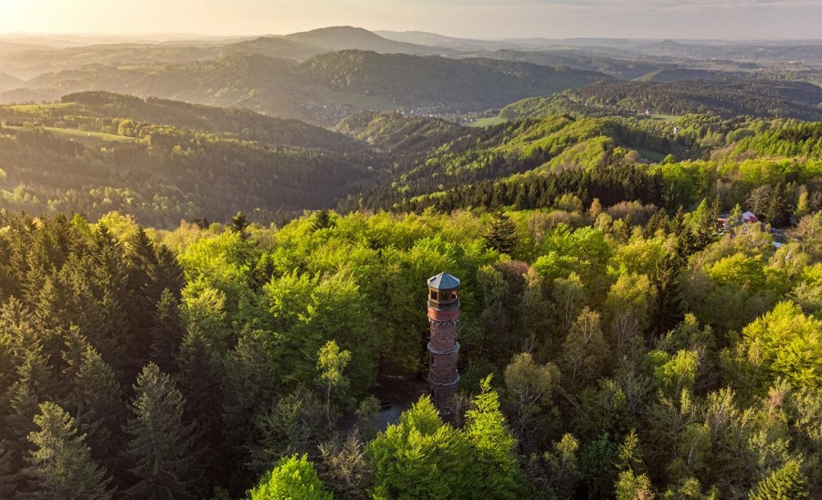 Pohled z vyhlídkové věže je vskutku impozantní – z jedné strany Kozákov a Maloskalsko, naproti Ještěd, na severu hřebeny Krkonoš a Jizerských hor a na jihu zamlžená Česká tabule se sopečnými kupami Bezdězu, Ralska a pískovcovými plošinami Českého ráje, z nichž ční jako dva hroty zřícenina hradu Trosky.