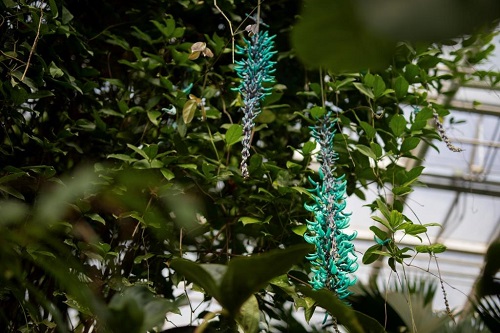 I ve skleníku Fata Morgana právě rozkvétají zajímavé exotické rostliny. Unikátní neonově modrozelená barva květů filipínské liány Strongylodon macrobotrys patří k nejnápadnějším v rostlinné říši. Přezdívá se jí proto „nefritová nebo smaragdová liána“. Převislá květenství bývají až 90 centimetrů dlouhá a opylují je netopýři, zejména kaloni. Ve své domovině patří strongylodon ke kriticky ohroženým druhům kvůli devastaci původních lesů.