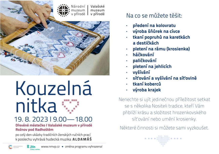 i dvě Nositelky tradic – paní Blanka Ammann předvede pletení na rámu a krajkářskou techniku síťování ukáže Lenka Macečková. Zájemci si budou moci vyzkoušet tkaní popruhů na karetkách a destičkách, pletení šňůrek na cívce, pletení na jehlicích či vyšívání a tkaní koberečku,“ pozval Jindřich Ondruš, generální ředitel Národního muzea v přírodě.
