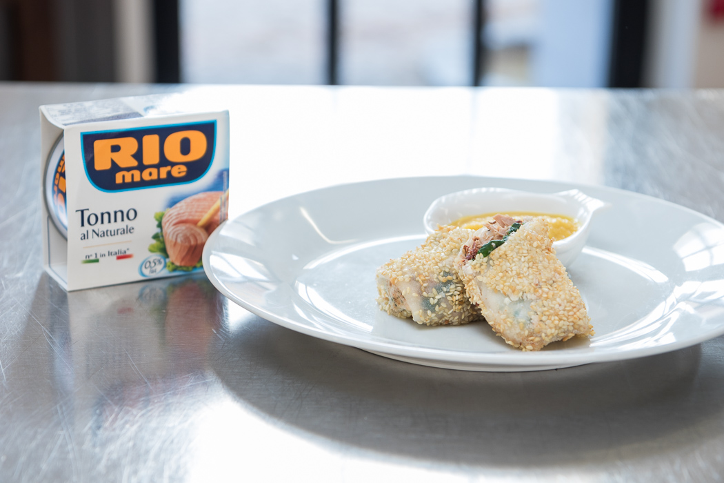 Suroviny (4 porce): 100 g tuňáka Rio Mare ve vlastní šťávě, 40 g šunkového krému Rio Mare Paté, 4 ks rýžového papíru, 6 polévkových lžic sušených rajčat, 10 lžic ricotty, hrst listového špenátu, 2 bílky, 3 lžíce hladké mouky, lžička sezamu; Na dip – 120 g manga, 80 g jablka, lžíce medu, lžíce extra panenského olivového oleje Monini, lžička balzamikového octu Ponti a citrónové šťávy Limmi, sůl a olej na smažení.